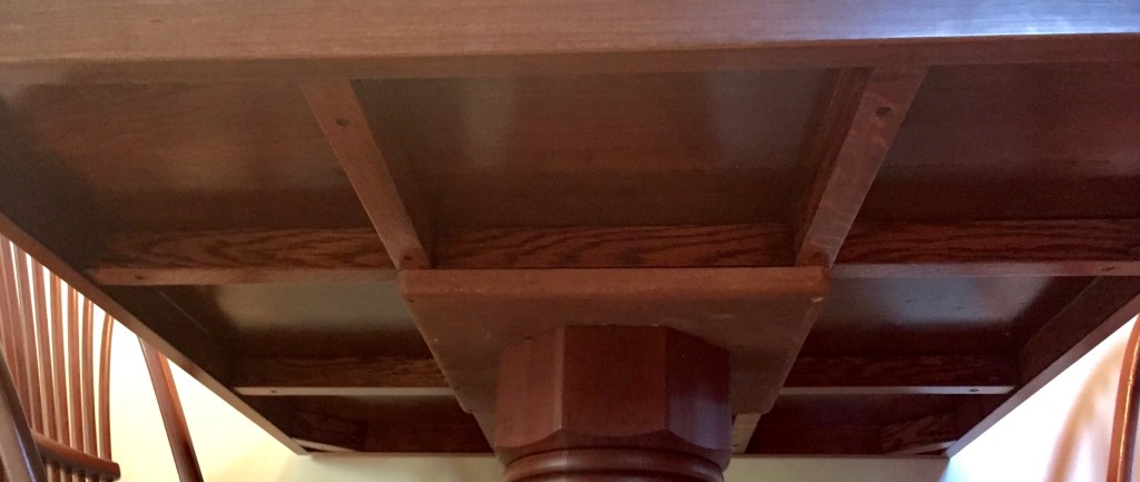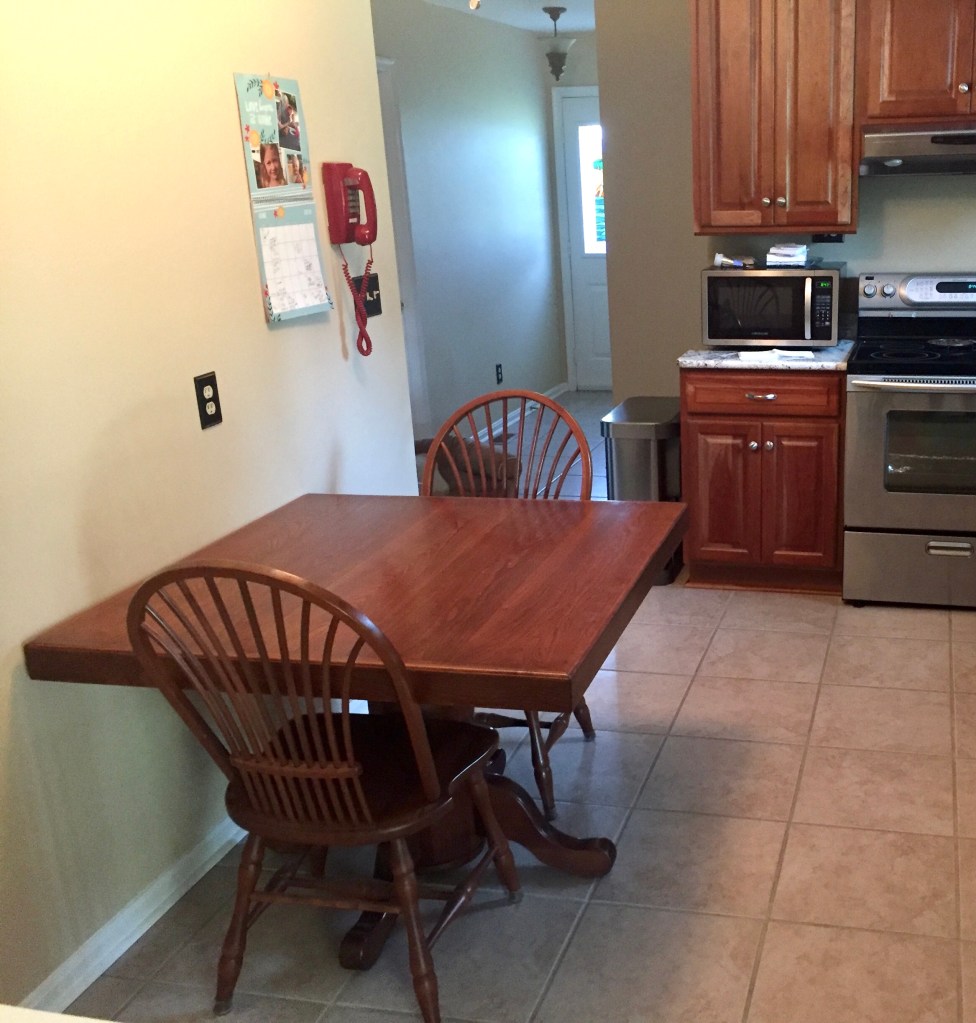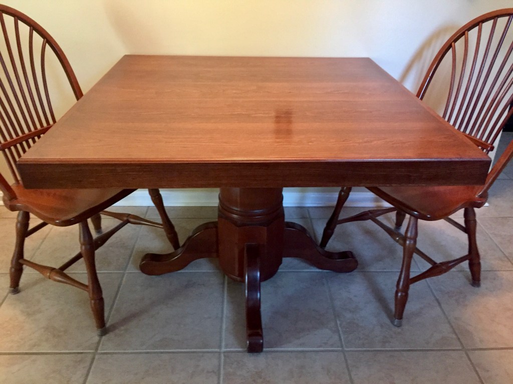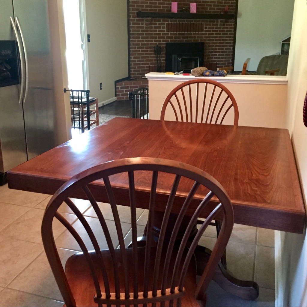 A new solid cherry table top for an existing table base. The original table top was too large for the space after this couple had moved into a new home. The new table top was designed to match the cherry cabinets.