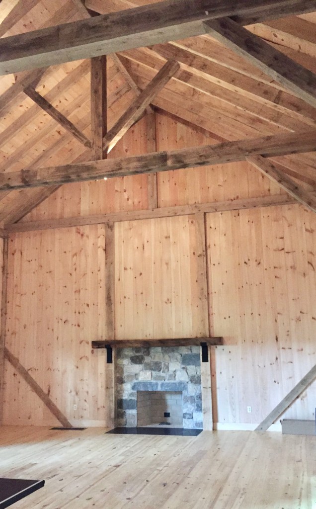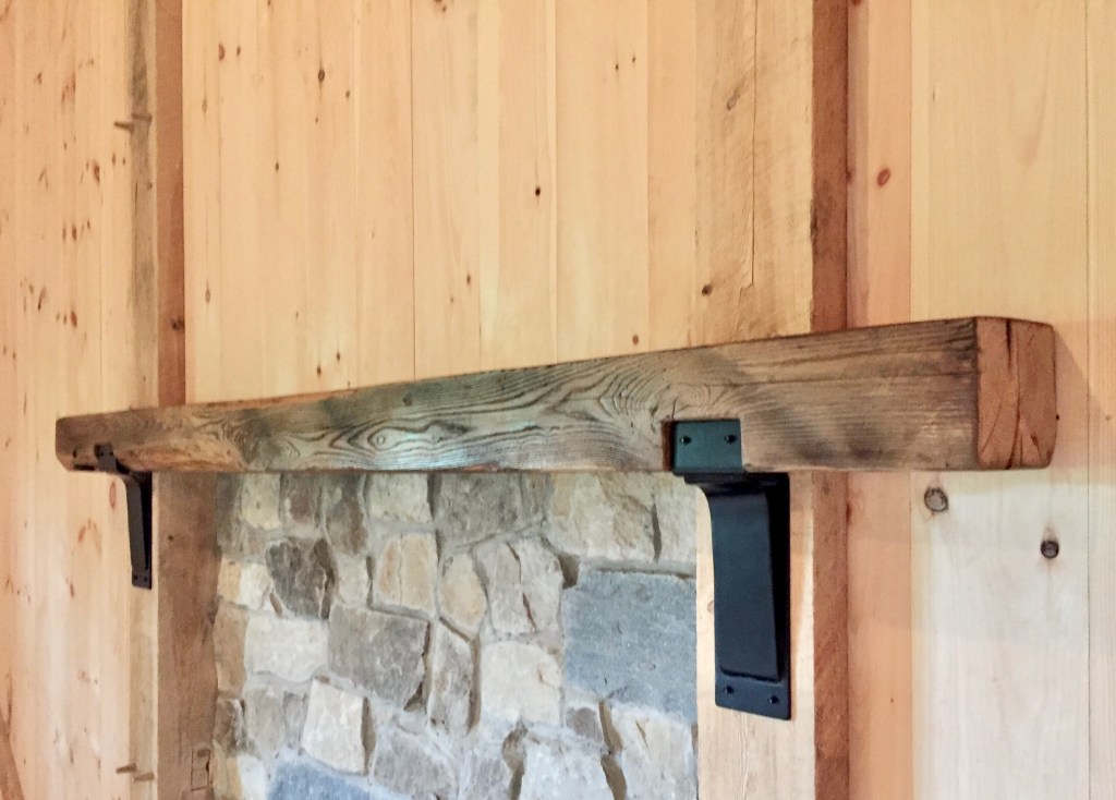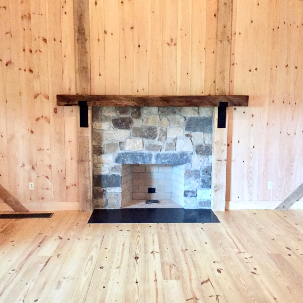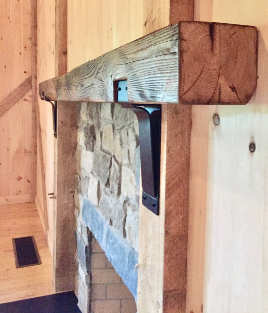 This mantle, sourced by the client for his entertainment barn in Baltimore County near the Pennsylvania line, was carefully chiseled and pressure fit on to the fire place. The beam beautifully accentuated, the Amish-built construction of the barn and surrounding forest.