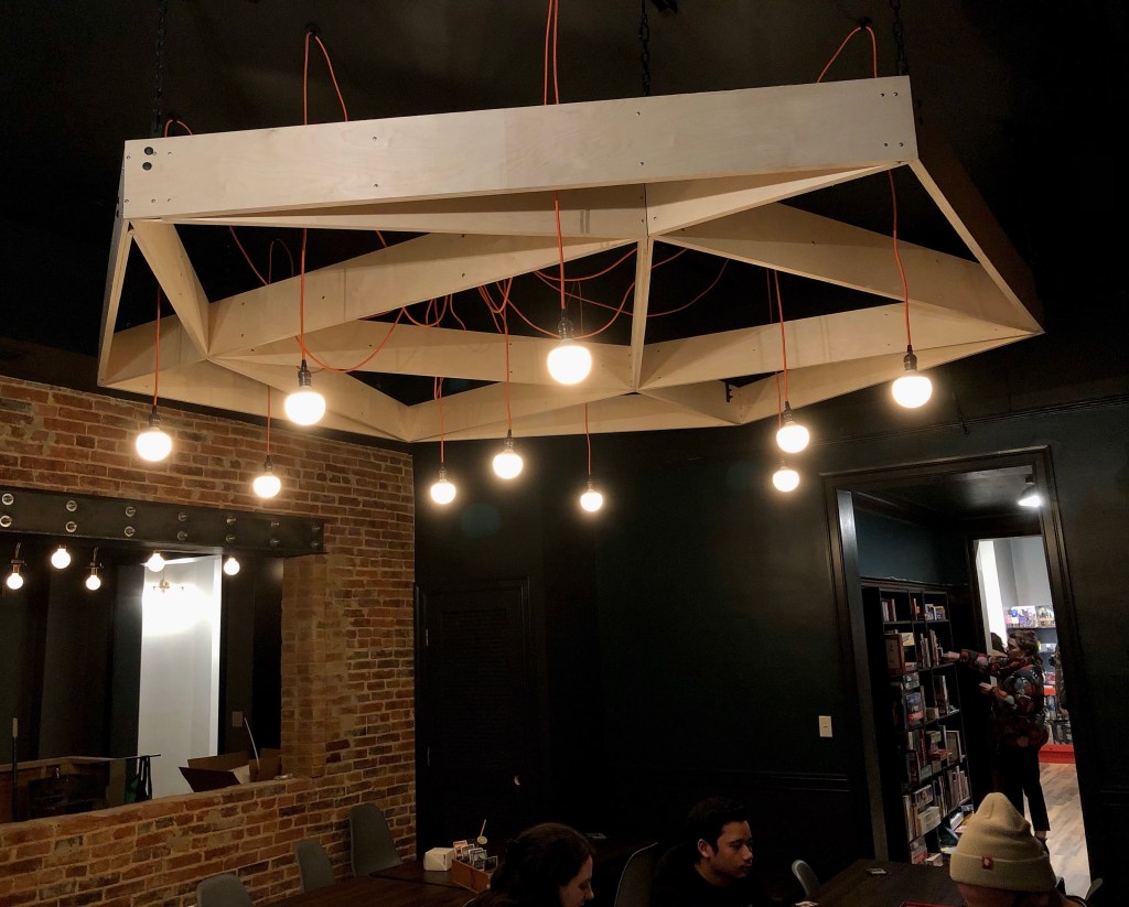 A local game store, No Land Beyond, opened a new location, complete with a gaming space and bar. The gaming space needed a suspended chandelier in the design of a twenty sided die. This chandelier was constructed out of Baltic birch plywood and was suspended from the ceiling. Graphite Woodworking collaborated with the store owners and the general contractor to get the massive 12’ diameter construction into place, and add lighting.