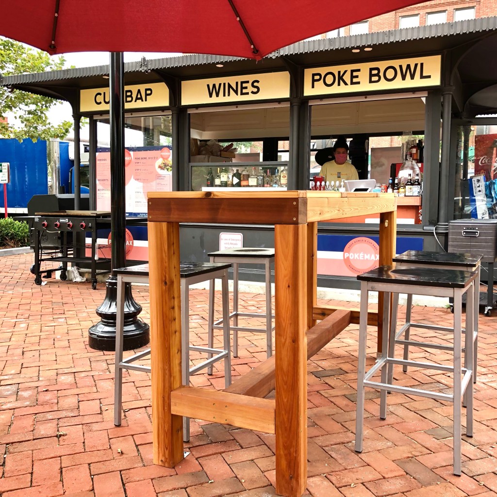 When the pandemic forced the restaurant industry to adapt, a local sushi restaurant opened up a poke bowl kiosk in the thriving Rotunda shopping and business center in the Hampden neighborhood of Baltimore. Working with the owner, bar-height tables were designed to create a casual gathering point for customers with an offset arrangement. The tables are built out of solid cedar and are finished with a completely eco-friendly and food safe oil.
