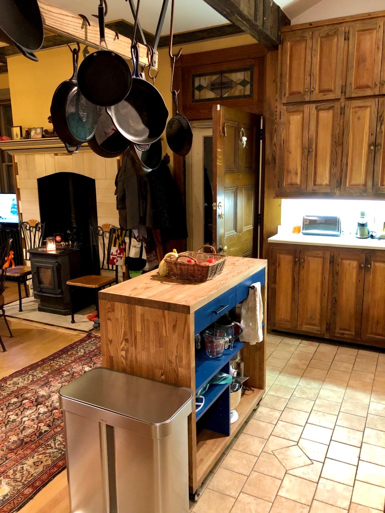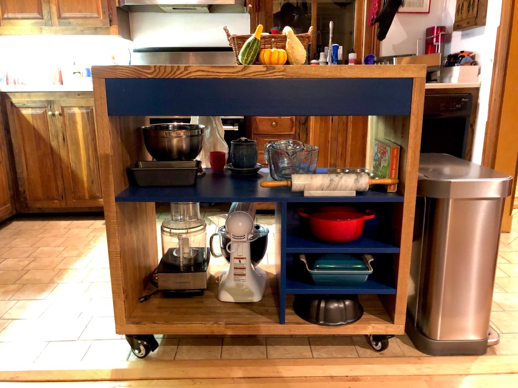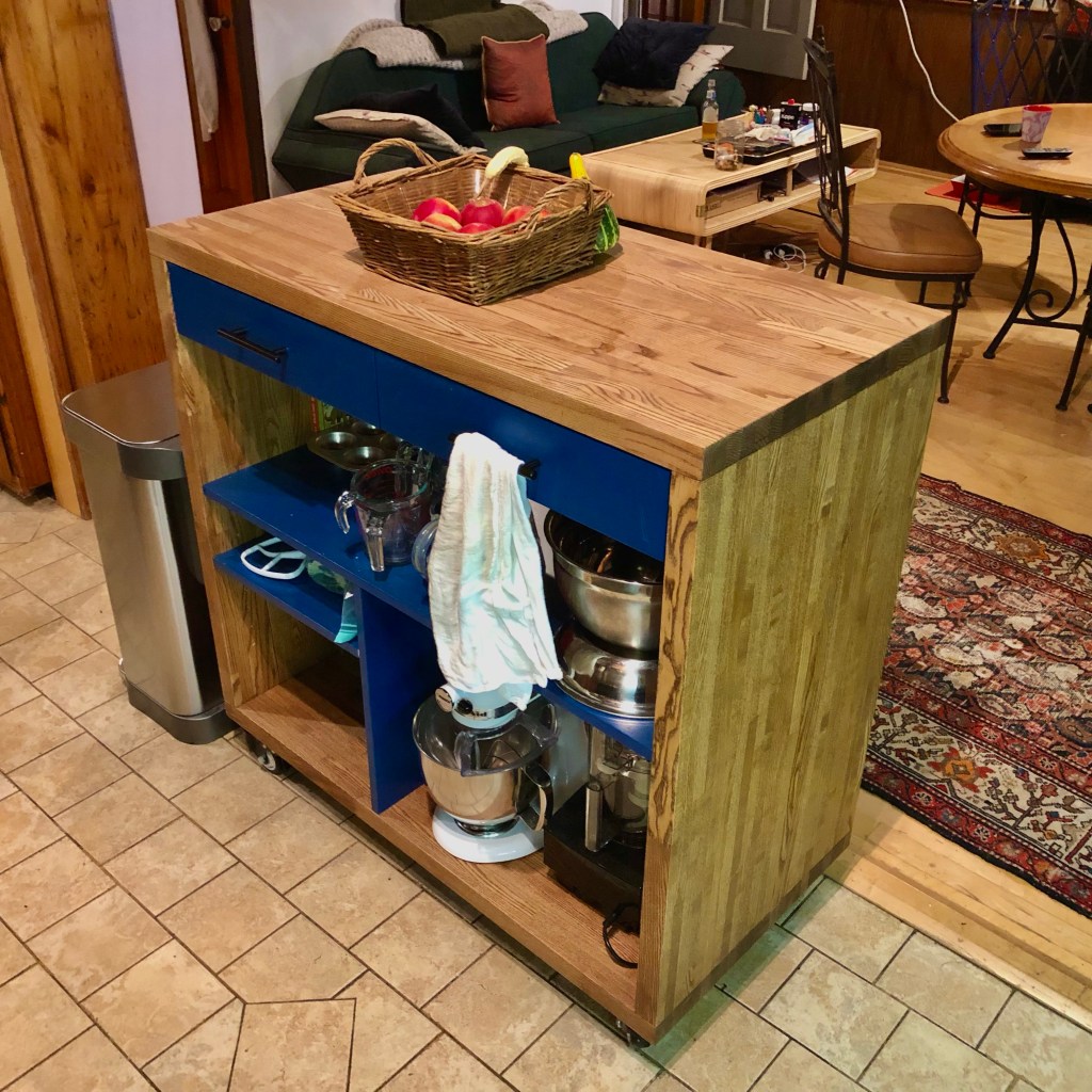 Ash butcher block, plywood, stain, butcher block conditioner, paint, drawer hardware, locking castors. Baltimore, Maryland. July 2020.