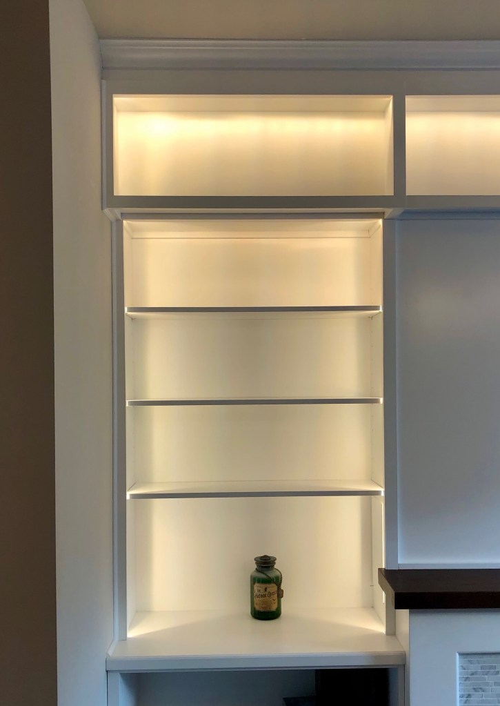 The fireplace surround is tile (done in-house) and is topped off by a mantle of solid dark walnut. To accent the items displayed on the shelves, we suggested built-in LED lighting. Also, as a nod to the clients’ wonderful cat, a cat shelf was added instead of a drawer below.
