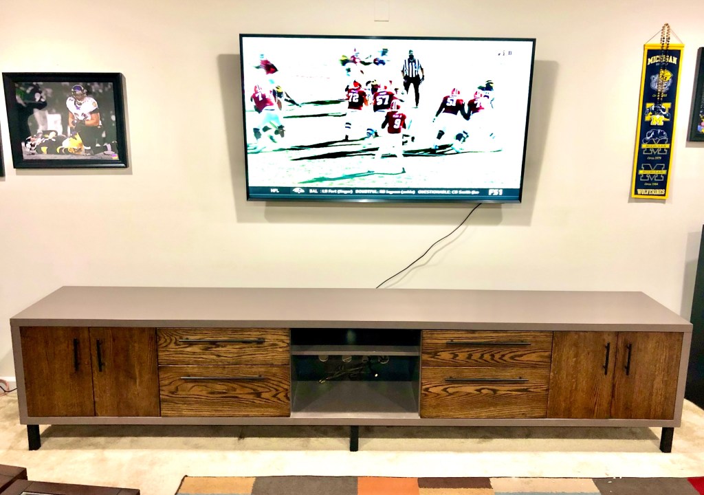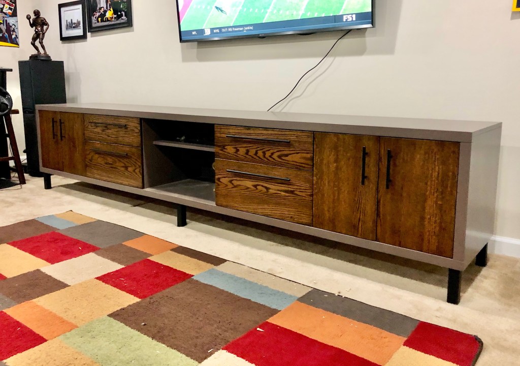 This ten-foot-long media console was for a client’s basement den. The console needed to store various items for the space as well as gaming devices and audio-visual components. The console has two sets for cabinet doors, four drawers and an open self for the AV components. The sleek painted box frames the rich dark oak of the doors and drawer fronts which ties small space together for everyone gathered for the big game.