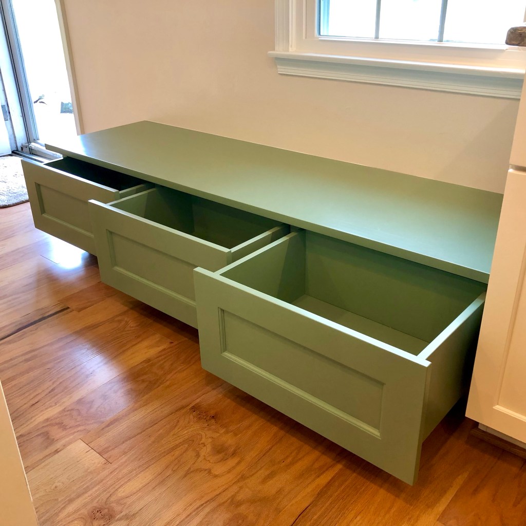 The client needed a built-in bench next to the back door of the house to put on shoes, drop-off groceries, and add some additional storage. We went with this design featuring push-to-open drawers. The bench is minimal yet functional and the color choice was selected by the client to match other built-in projects around the home.