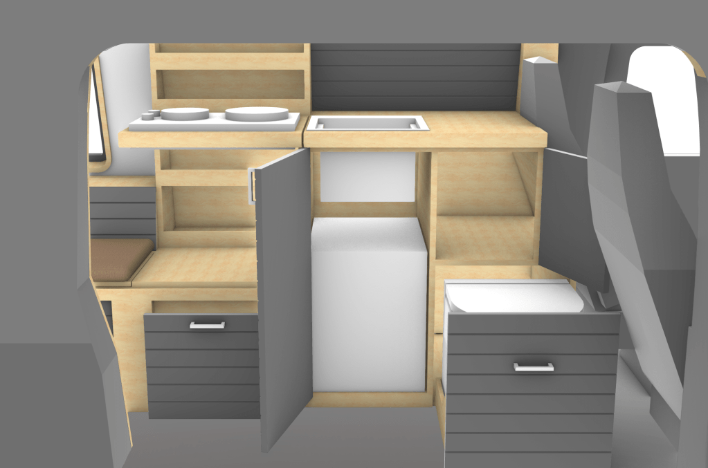 Commissioned in the the summer of 2022, this exercise was to design a camper van interior from scratch. The client’s van is a 1995 Chevy that was a previous camper van which was stripped down to the structure. Starting from there, an accurate measure-up of the space was conducted to determine the as-built conditions. A 3D model was then recreated of the interior space using Rhinoceros. Using the base model, all of the clients practical needs were used to design a camper space that was both functional and aesthetically pleasing.