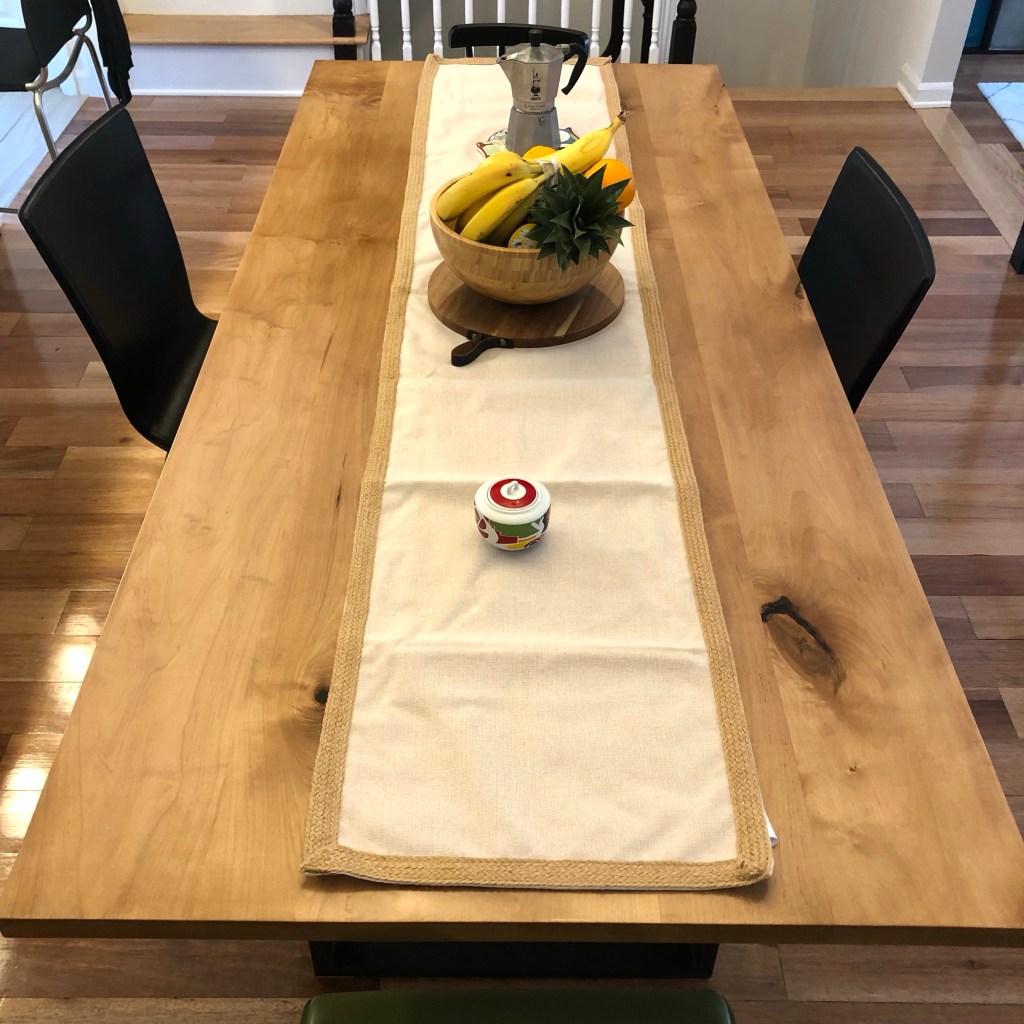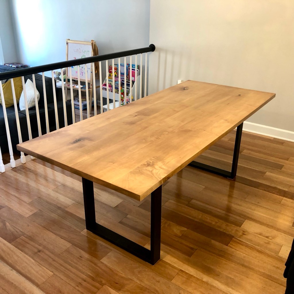 This dining room table was commissioned by a young Italian family recently emigrated to the DC area. The table is solid hard maple, stained to match the flooring, the legs are steel, and the table is sturdy enough for many family dinners for years to come.