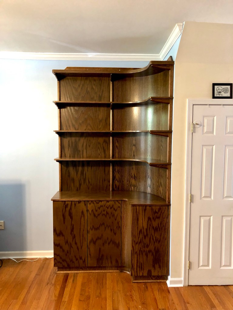 Solid red oak, red oak veneer plywood, red oak veneer on bending lauan plywood, structural plywood, stain, clear glacquer, cabinet hardware. Baltimore, Maryland. July 2022.